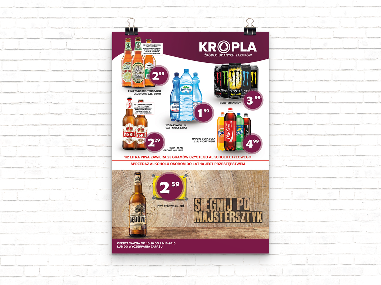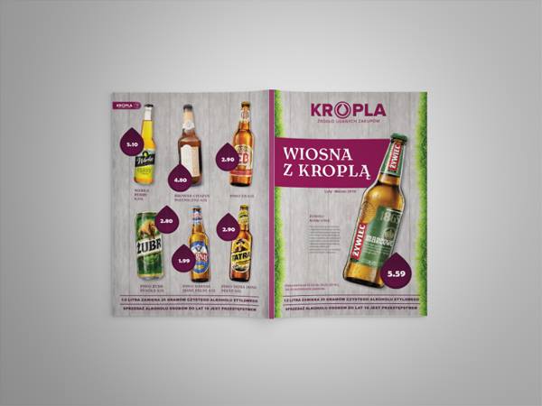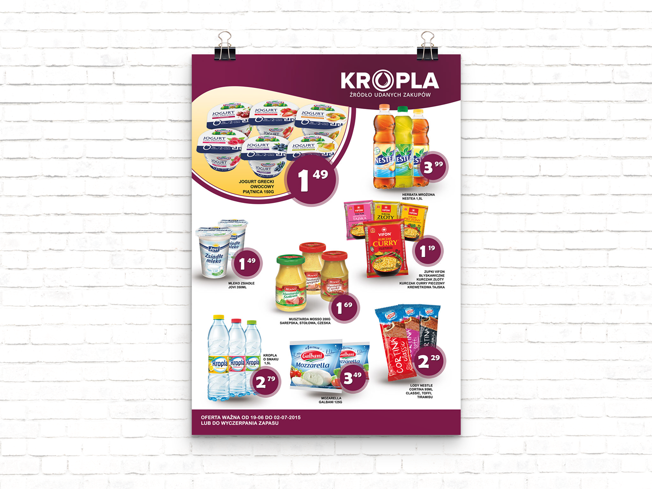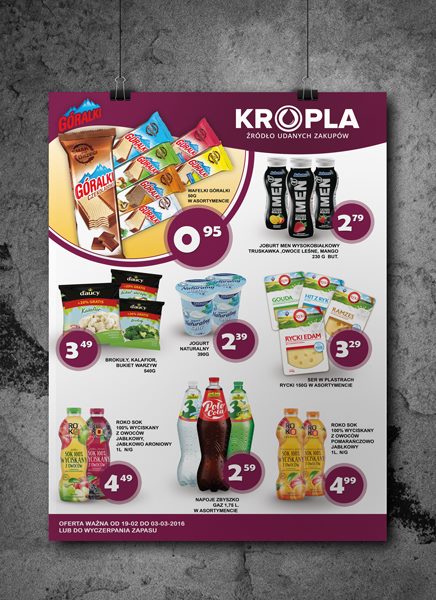 Dla sieci sklepów Kropla zaproejktowałem identyfikację wizualną, gazetki i plakaty ofertowe.